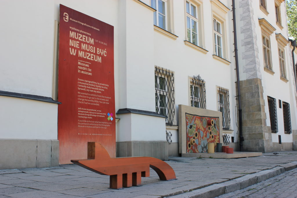 Wystawa „Muzeum nie musi być w muzeum” jest kolejnym krokiem na tej drodze. Plenerowa, interaktywna i otwarta dla szerokiej publiczności ekspozycja jest zarazem ćwiczeniem wyobraźni oraz próbą przeobrażenia „kawałka świata”, w tym przypadku placu Wolnica w Krakowie. Dzięki tej interwencji pusta przestrzeń niegdysiejszego forum liberum zapełnia się instalacjami, pośród których każdy może znaleźć miejsce dla siebie. Aranżacja czerpie z bogatych zbiorów Muzeum, w tym ze spuścizny Warsztatów Krakowskich, a także wzorów kultury tradycyjnej (wycinanki, malowanki, stroje, zdobienia). Opowiada o niegasnącej woli tworzenia, o potrzebie zostawiania śladu po sobie, o relacjach z materią i formą.